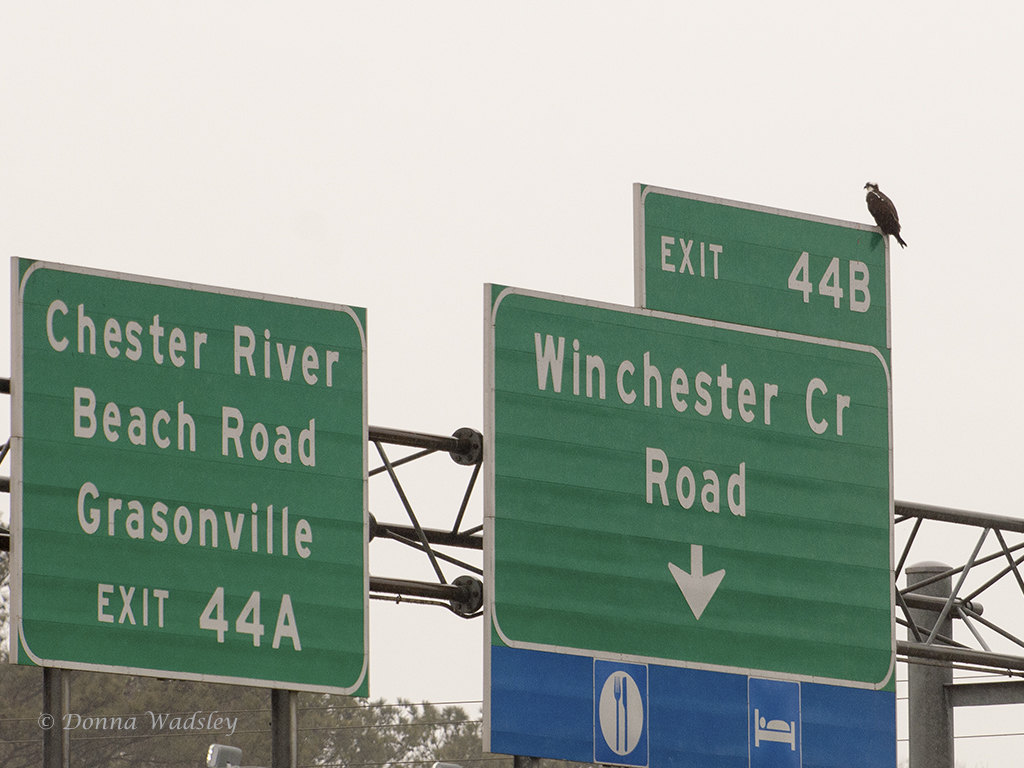 For the last week, I have had my eye to the sky and at least a dozen Osprey nesting locations in my local area, searching for a first sighting on the return of our Osprey. This overcast, rainy afternoon it became official. I captured an Osprey on his highway sign on Rt. 50/301 through the Grasonville/Kent Narrows, Maryland. This is one of three active nests along this corridor area.