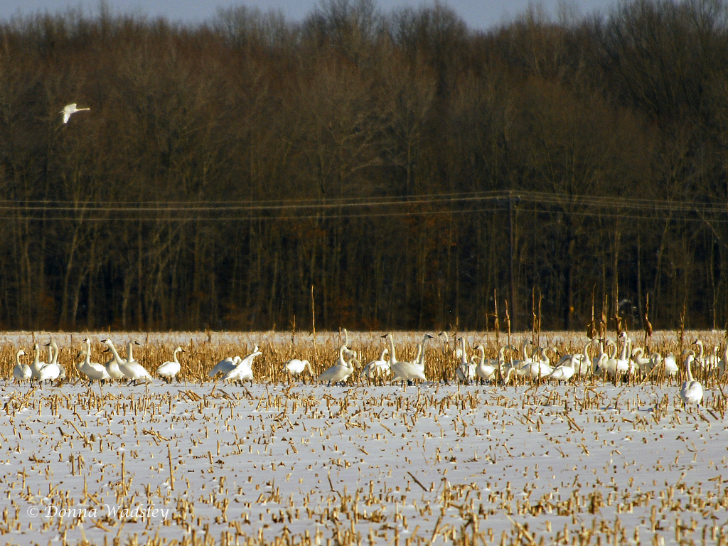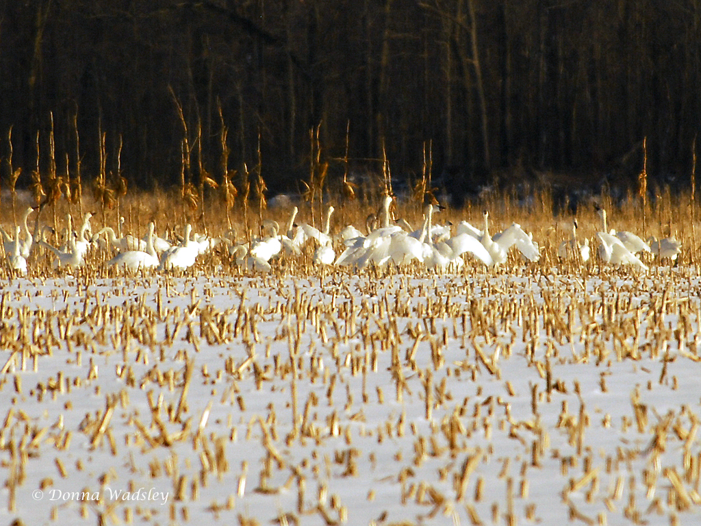 So heading home Saturday afternoon, I was hoping to see Snow Geese again somewhere along the way across the Eastern Shore Maryland farmlands. Just west of Barclay on the corner of Rt 302 and Big Wood Road , I did catch a glimpse of white on white. Snow Geese? No….but it was a small flock of Tundra Swan! They were resting and feeding in the middle of a farm field, which is not something we see often, as the Tundra Swan are usually seen on the water.