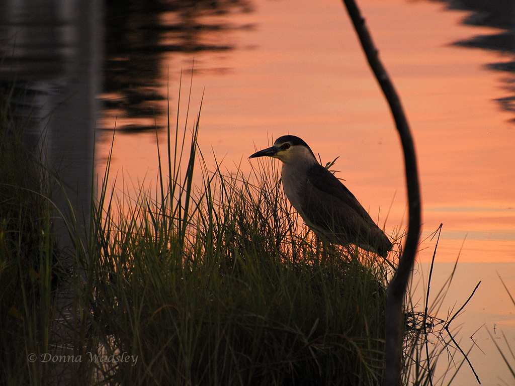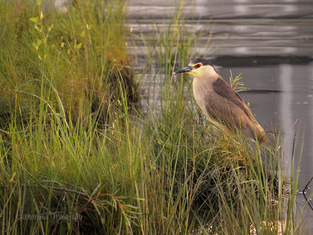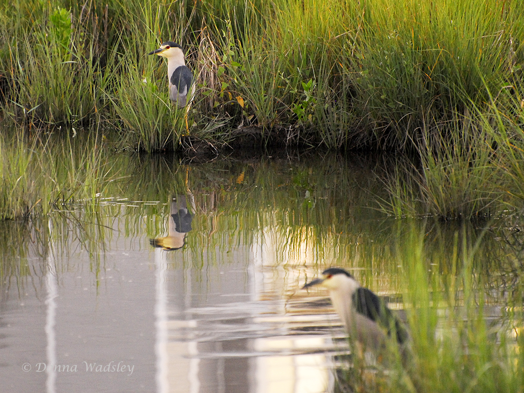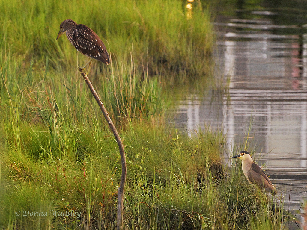 While zooming out on Dad, I spotted a third adult Black-crowned Night-Heron in the grass beyond him