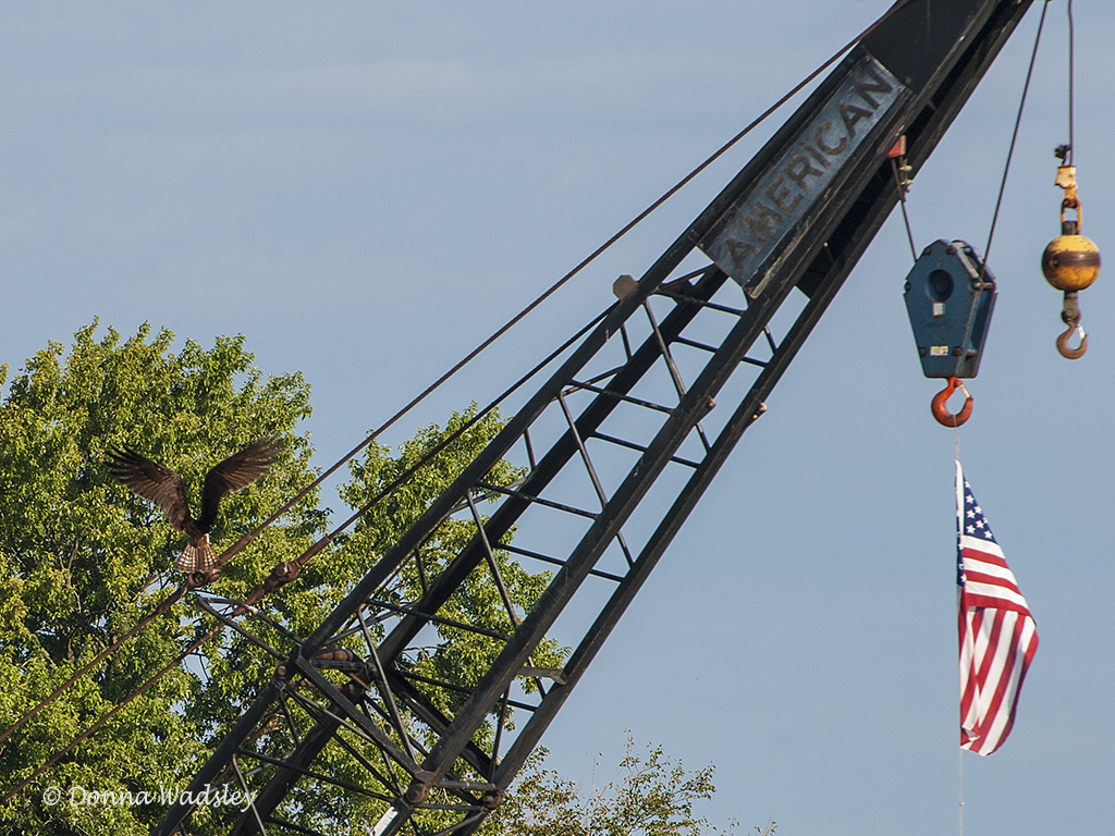 Bella flies with the fish to the crane and lands.