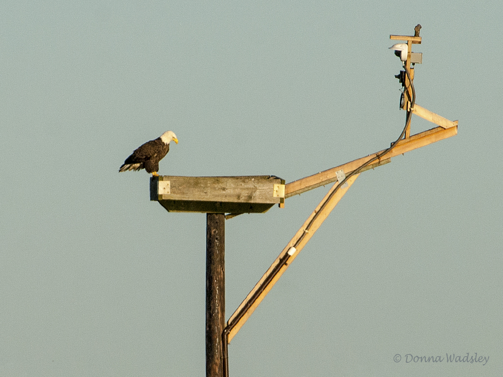 Bald Eagle perched on Osprey platform set up with a live-stream camera.
