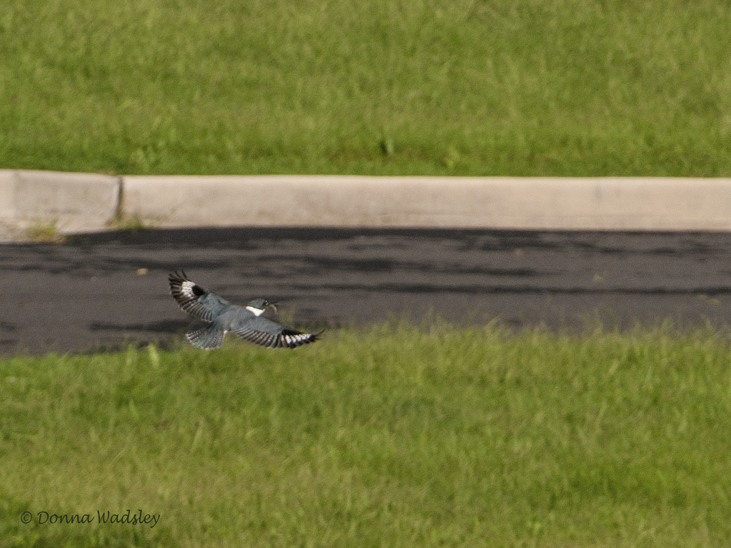 Belted Kingfisher in flight with fish.