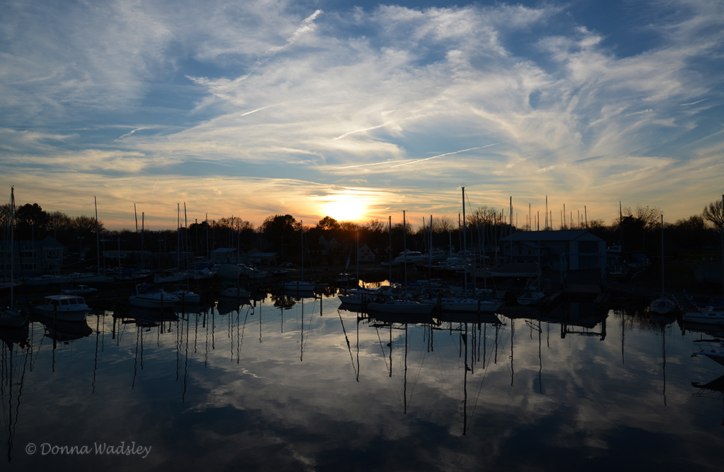 The glow in the first sunset is pleasing as well as the images to follow. The reflections of the masts and clouds in the water have my eyes dancing around the picture in a pleasing way. very pretty and peaceful looking.