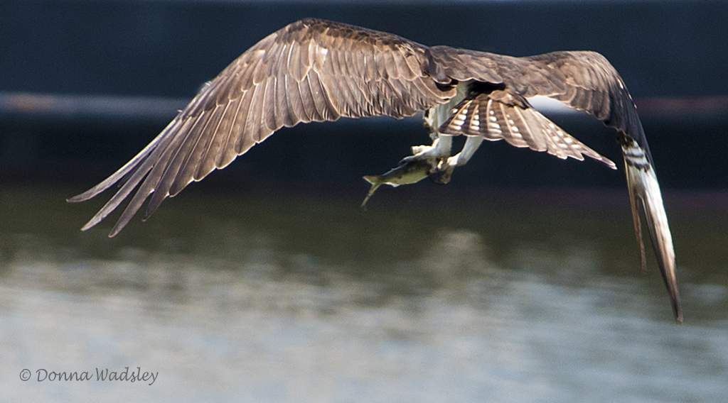 Bella transfers the fish from her beak to her talons