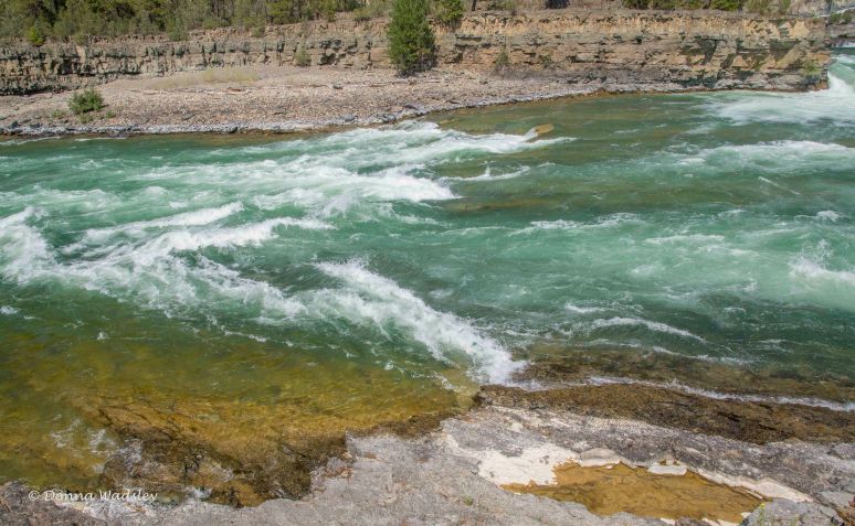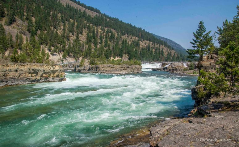 The calmly flowing Kootenai River suddenly picks up speed as elevation begins to drop with running rapids, eventually to Kootenai Falls which drops 300 feet over several hundred yards. The widest point of the falls is 1,000 feet. It is one of the largest free-flowing waterfalls in the northwest United States.