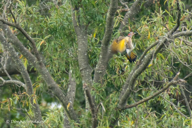 A Northern Flicker was chasing a female and obliged with a pretty yellow wing-wave on the way by!