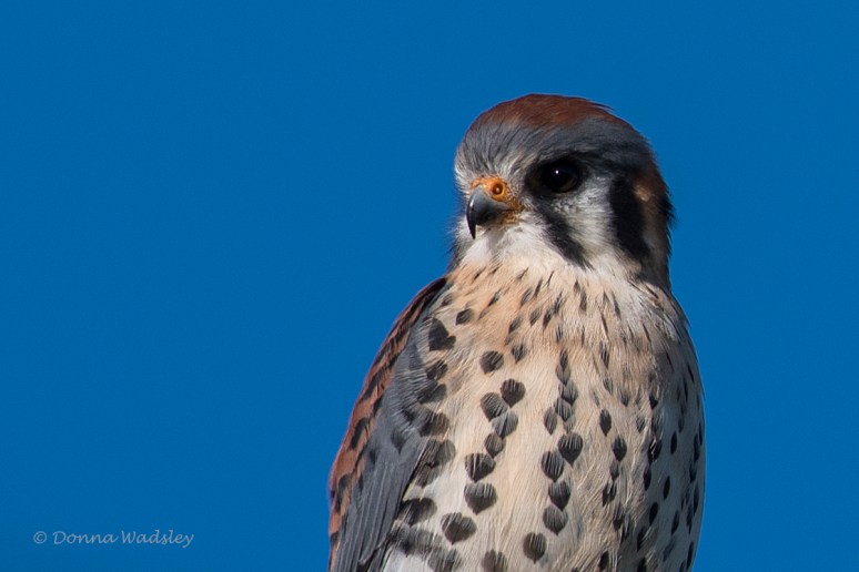 And then it happened. I got lucky, truly lucky. I was on a rural country road, and ahead there sat a male Kestrel up on the wire to my left. He stayed put as I pulled right up alongside and took a dozen shots. He moved twice giving me two profiles.
