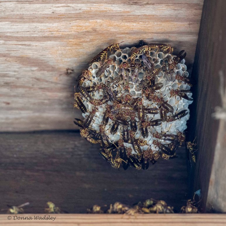 I glanced around inside the duck blind, and….whoa….backed out quickly when I saw this active wasp nest above me in the ceiling corner.