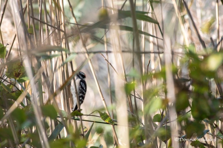 It was a delight to first hear and then finally spot a Downy Woodpecker, tapping away on dried marsh reeds, going from one to another. Trying to get a shot in the reeds was hard, I got one decent to show the behavior.