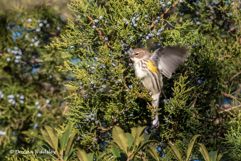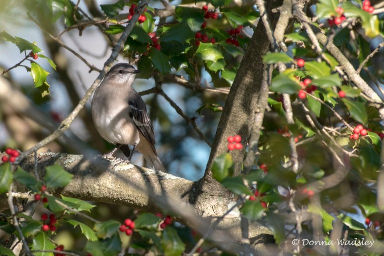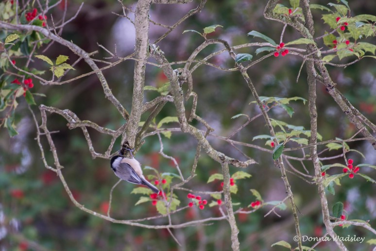 I have three juniper trees entwined with four American holly trees off the far end of my backyard deck, loaded with lots of red and blue seeds. My practicing is paying off with some ‘berry-good’ photos for my favorites’ files.