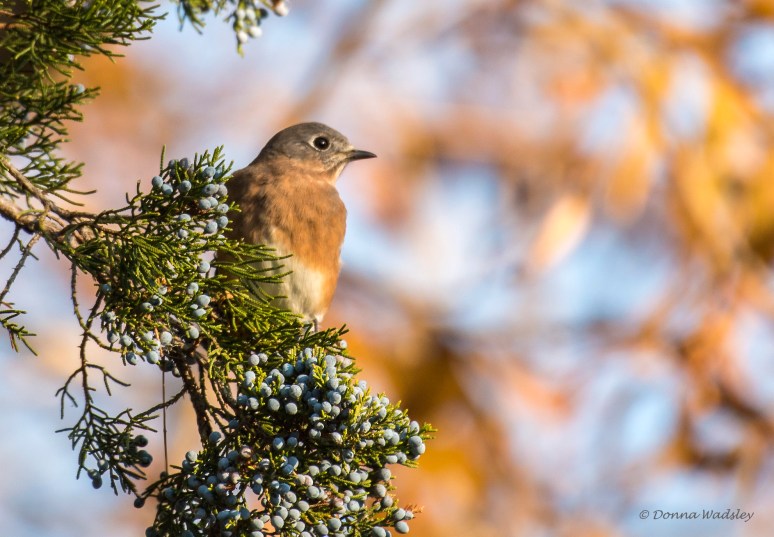 Eastern Bluebird (female) at sunrise with cedar berries