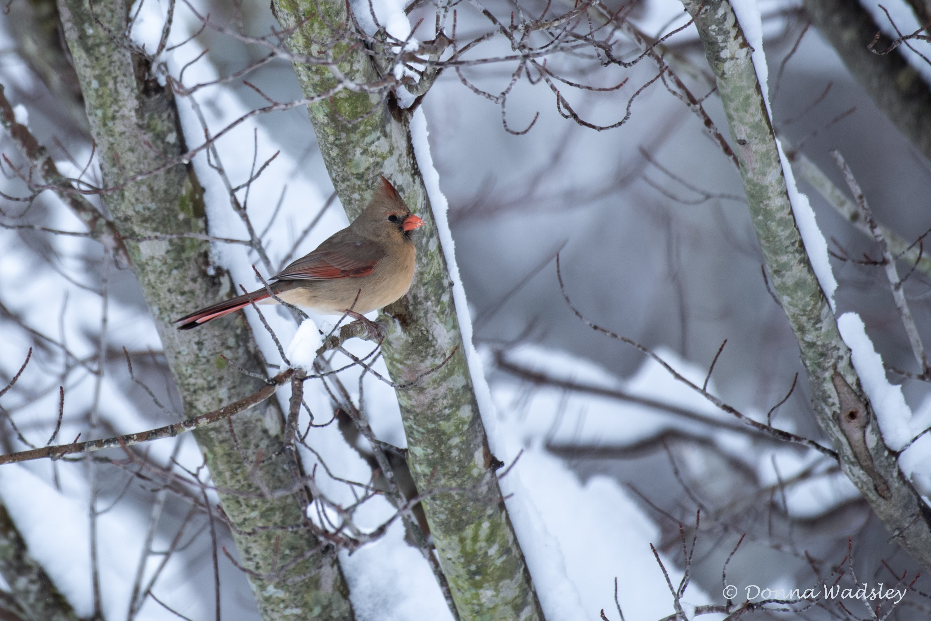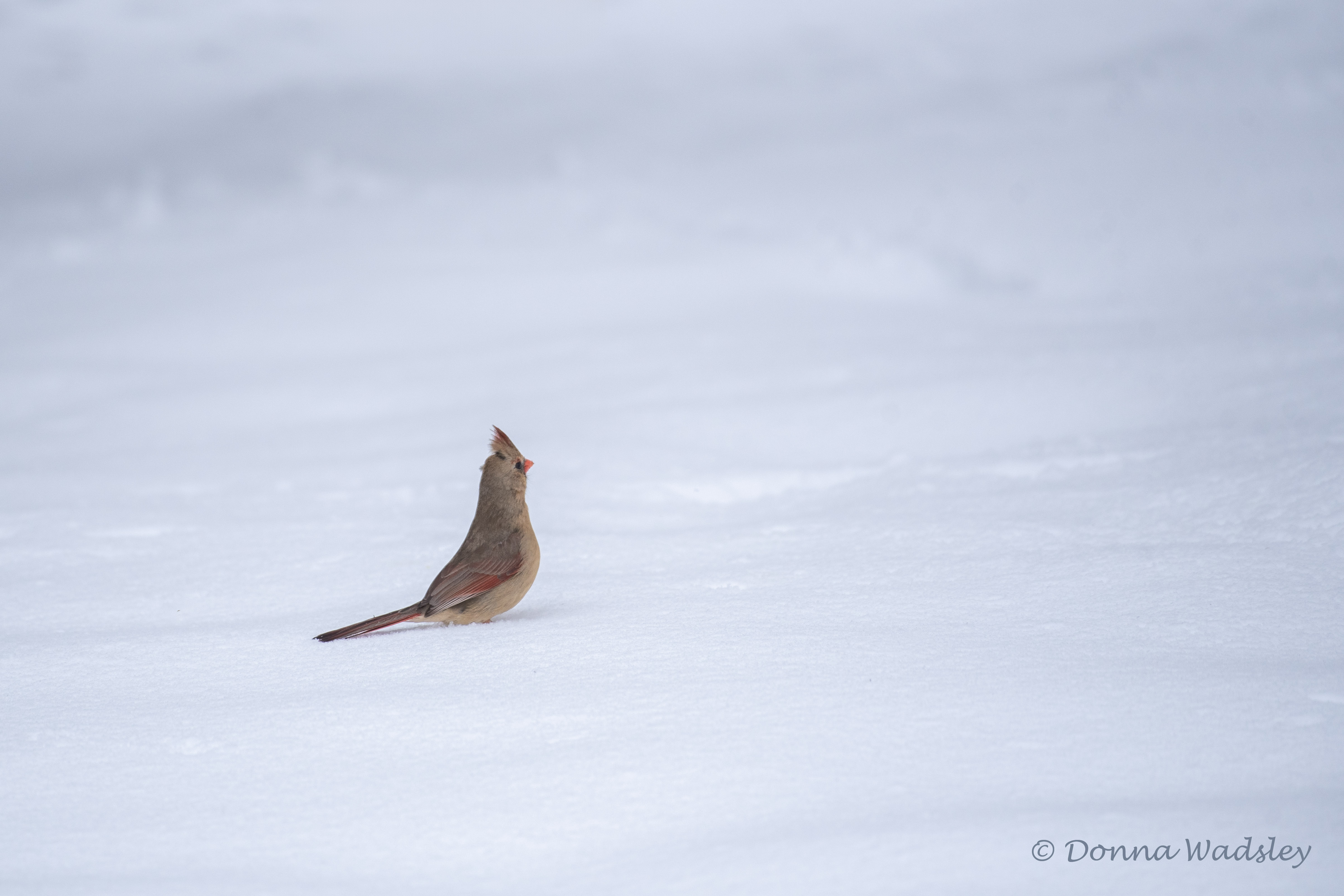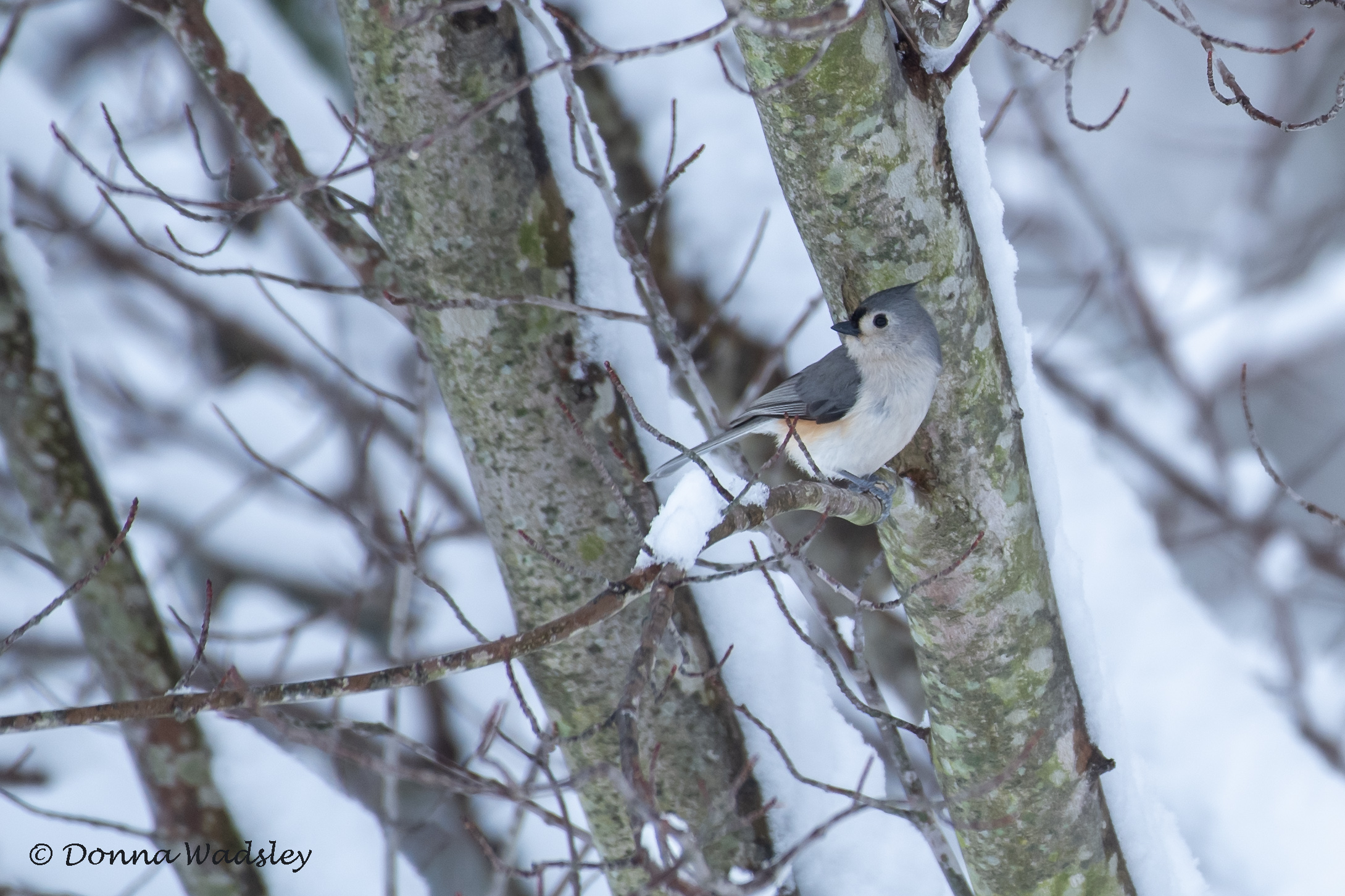 From Tuesday afternoon through the wee hours of Wednesday morning, we were walloped with 8-9″ of snow. When I got up, my backyard birds were already busily looking for the buried food that I had put out on the ground and in branch crevices in ‘their’ tree just before the snow began. I stepped out on my back porch and took some photos of the birds against the winter landscape.