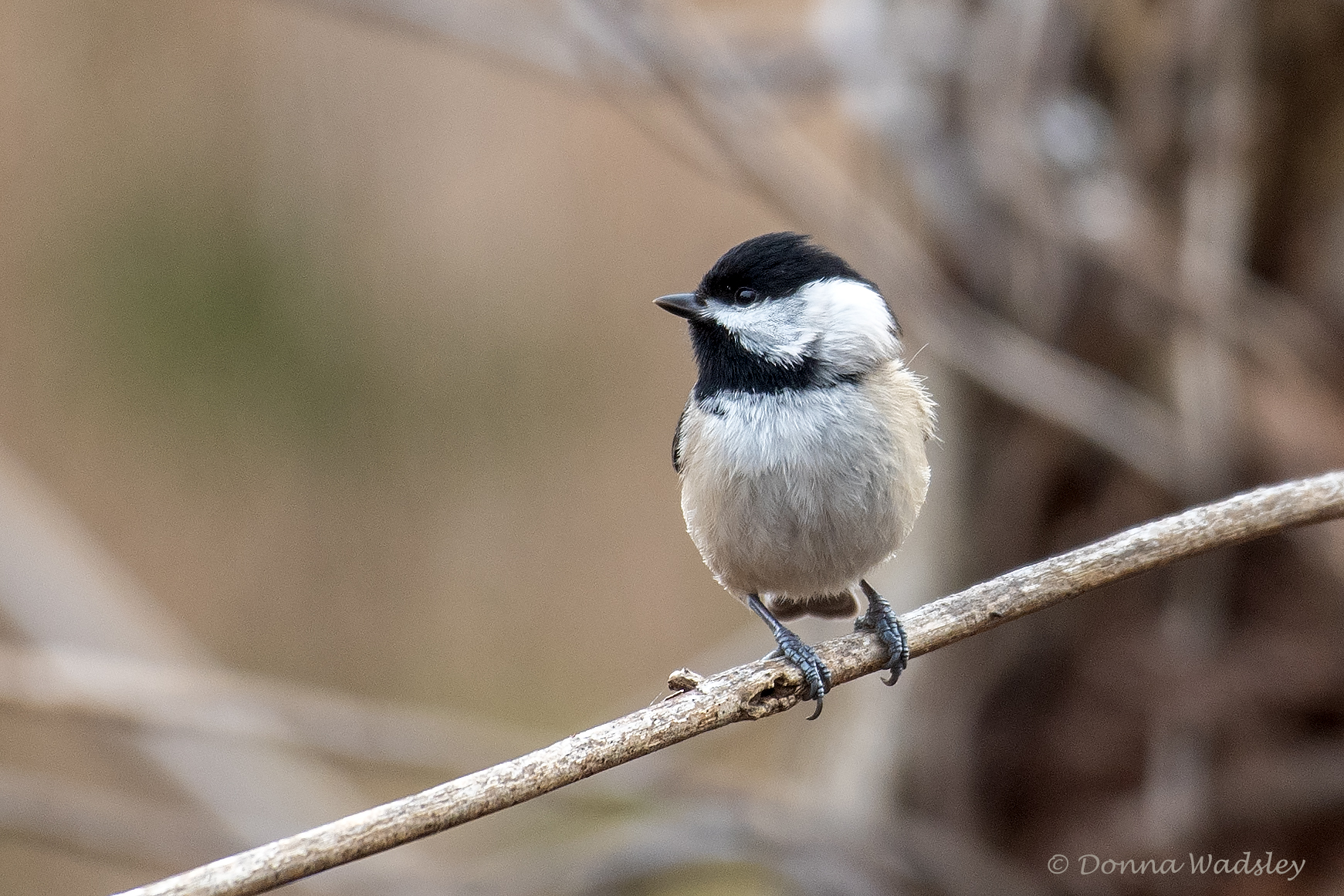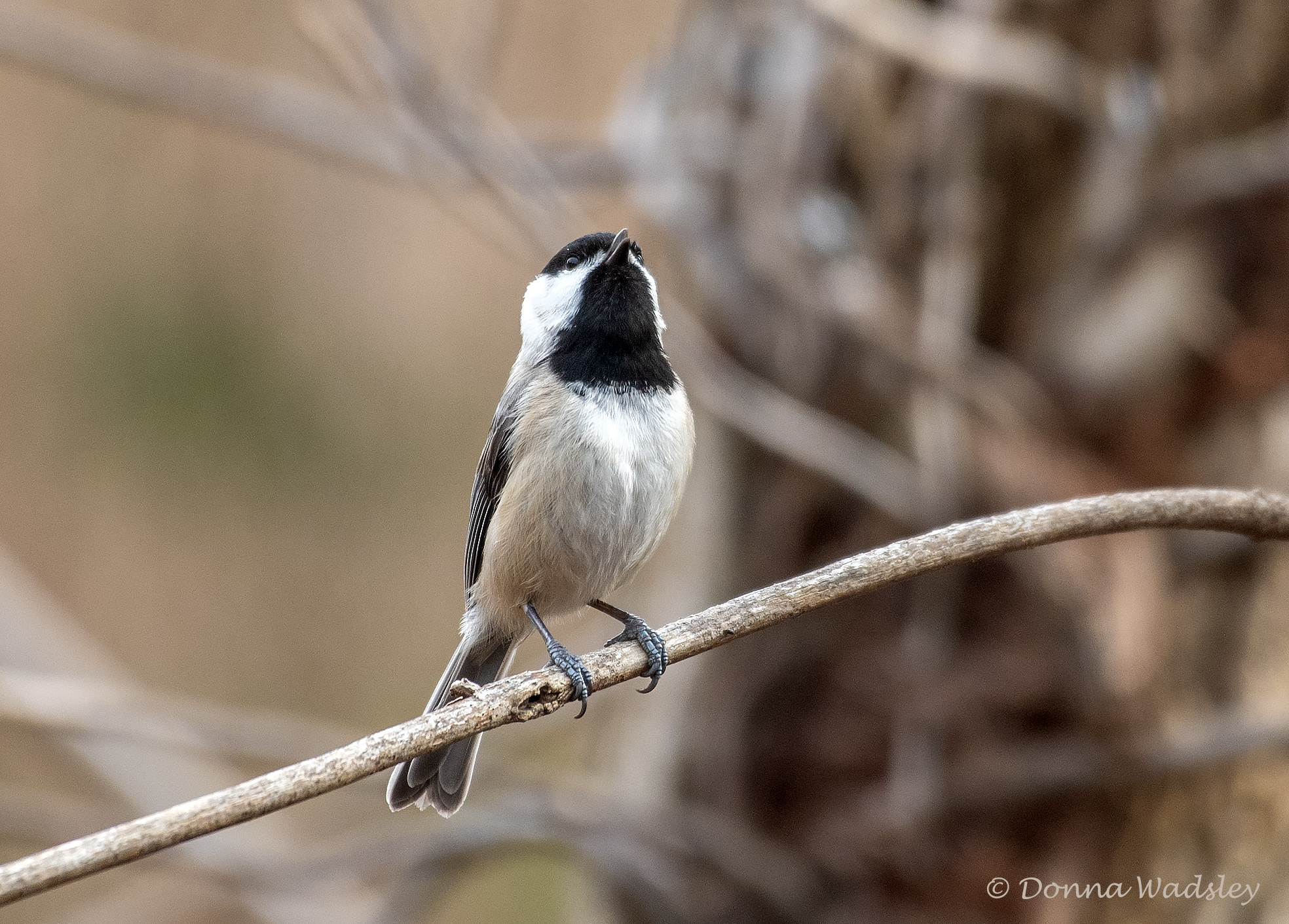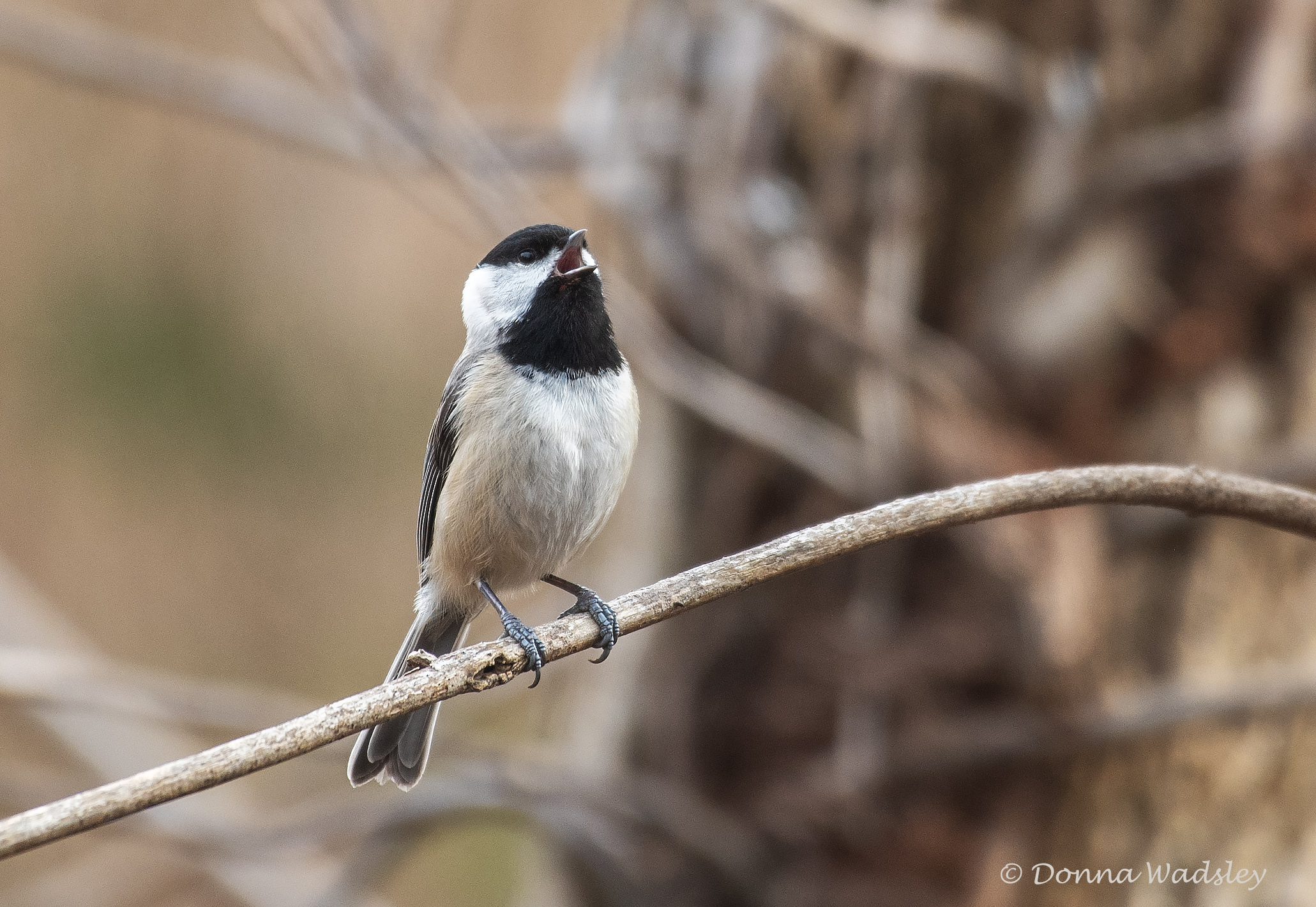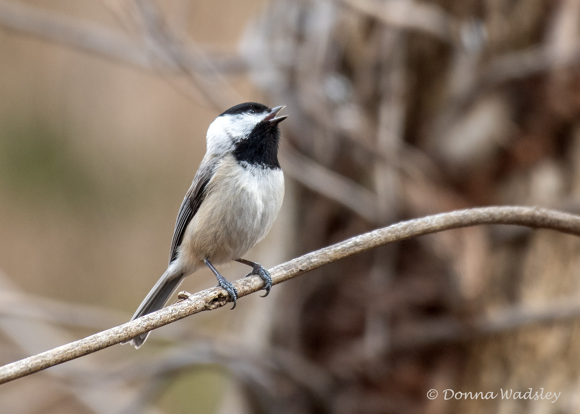 This adorable Carolina Chickadee is happily singing his little heart out on a branch above my empty bluebird nest box he had just investigated both inside and out. He was telling his gal it looked good to him for a home!