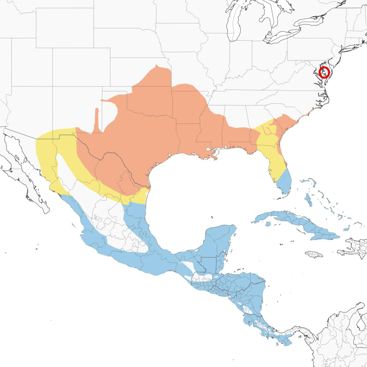 (orange, breeding; yellow, migrating; blue – winter grounds; red – Maryland sighting)