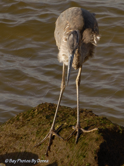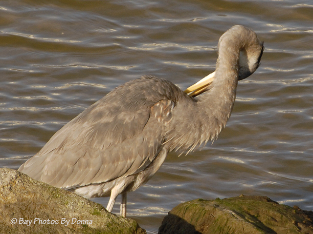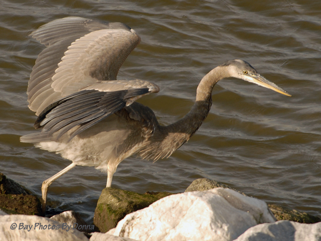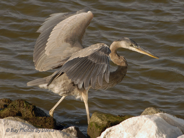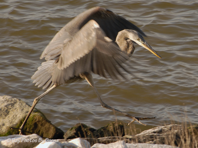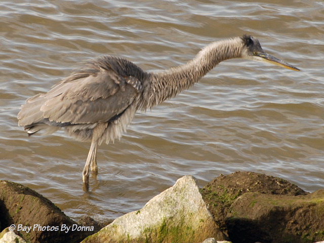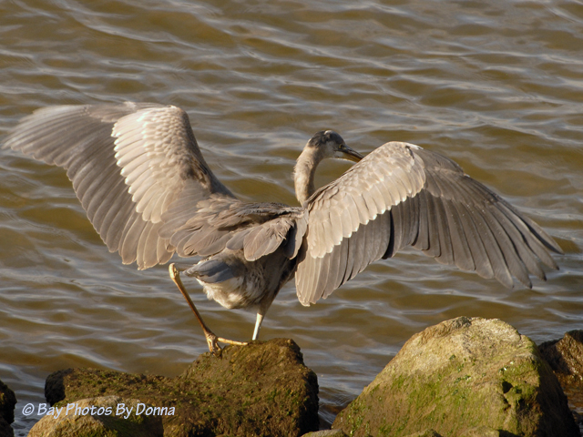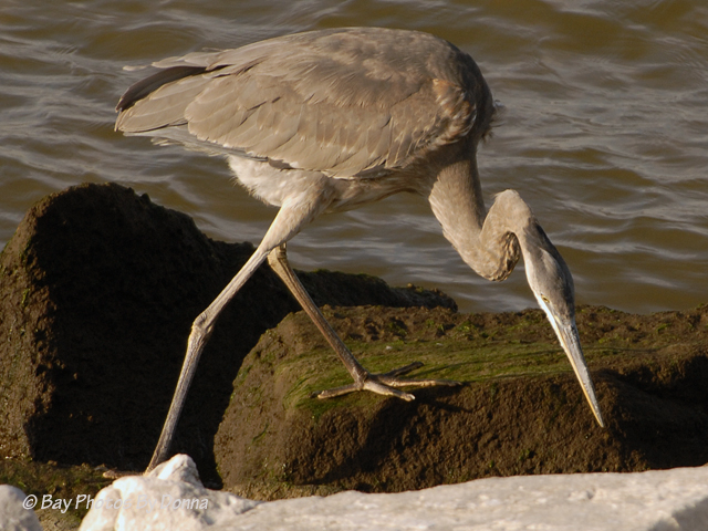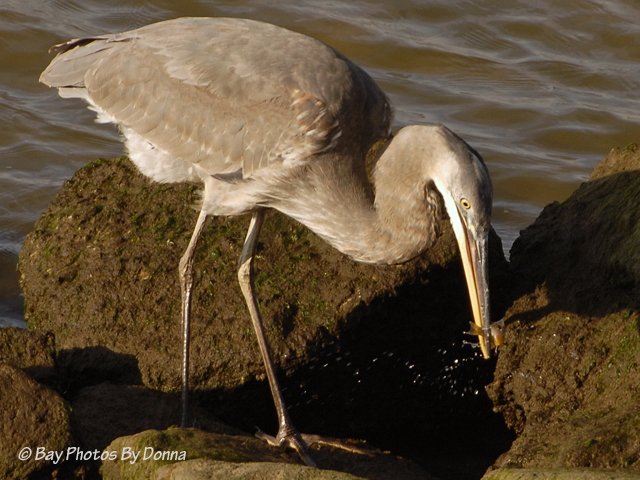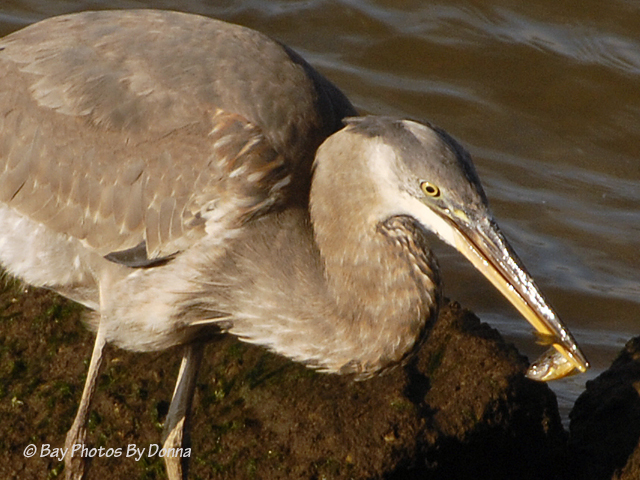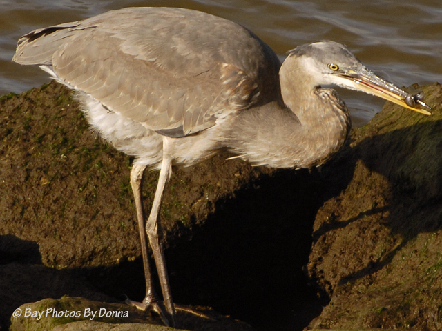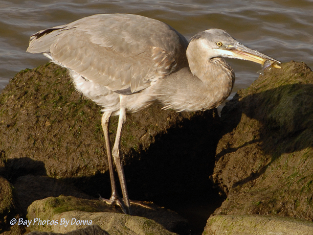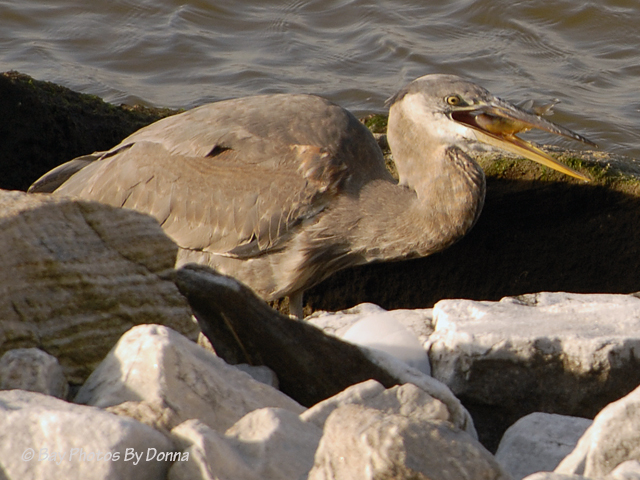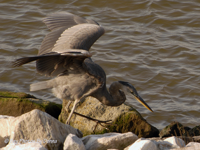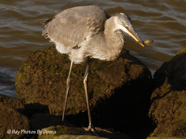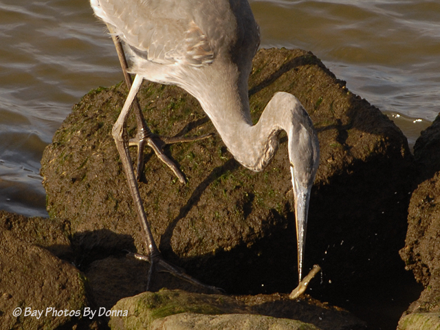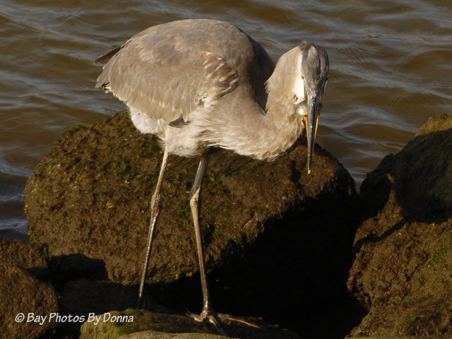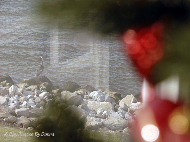 And then the sun arose and shone on Saturday. It was my day to decorate for Christmas. A quick glance outside around 9:30 a.m. after dragging everything out, and lo & behold I spotted Blake, our Great Blue Heron, down on the berm during an extreme low tide. Blake hung around for a couple of hours, fishing with huge success in the shallow waters. I saw him catch eight small fish in just a few minutes that had gotten caught up in small pools of water that formed within the rocks. It was easy-pickin’ for him! Although it was hard to not spend the entire time just watching him, I did steal a few moments here and there and captured many awesome shots. So many so, it was hard to select just a few to share, sorry. 🙂 So here’s Blake in action!